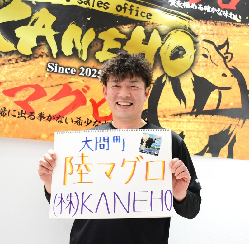 強風によろめきながら大間町へ。「大間のまぐろ」と「陸(おか)マグロ 大間牛」と書かれたのぼり旗が激しくはためく店舗に到着。市場に出回ることがない希少な黒毛和種の大間牛(愛称「陸マグロ」)を求めて、生産から販売まで一貫経営に取り組む「KANEHO」の南隼人社長(42)を訪ねます。