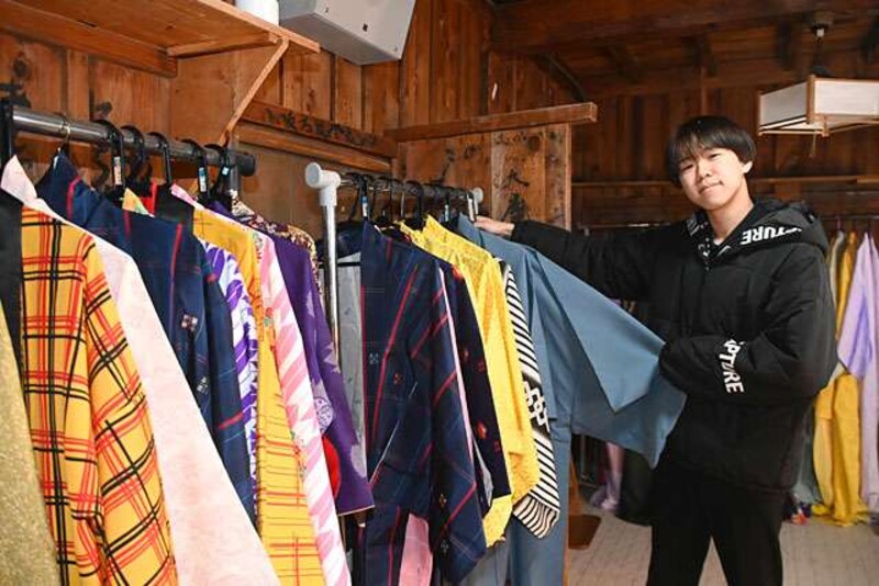体験会は冬季限定で昨年から開催。着物は男女約20着ずつ、かつらは8個ずつを用意している=写真。刀などの小道具も使用可能。体験時間の30分間で、舞台や花道など館内どこでも役者になりきって撮影できる。