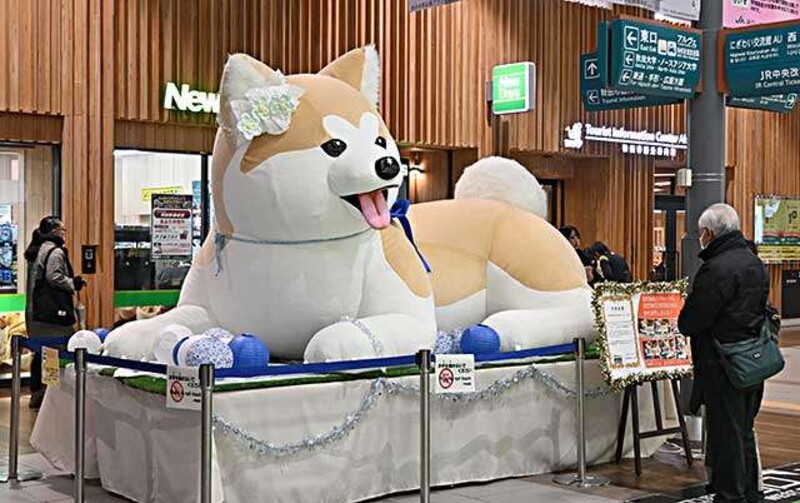 秋田市の玄関口・JR秋田駅の中央改札口前で利用者を出迎える秋田犬の巨大バルーンが昨年、2代目に代わった。