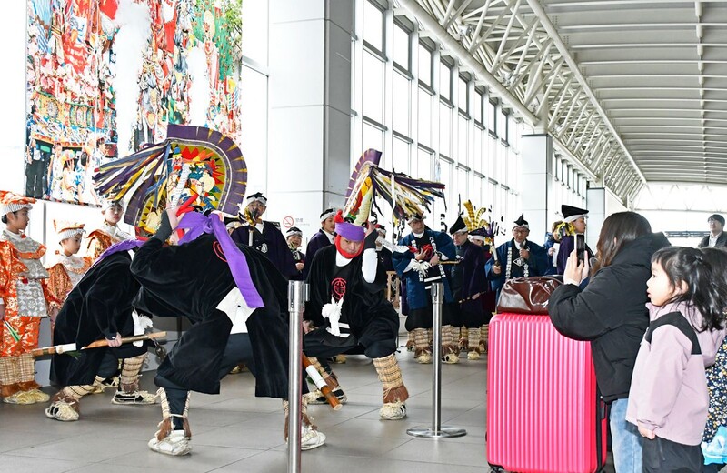 2月17日に開幕する八戸えんぶりの魅力を広く知ってもらおうと、八戸圏域DMO「VISITはちのへ」は10日、八戸駅の東西自由通路でえんぶりの披露を行った。駅利用者らは青森県南地方に春を呼ぶ伝統行事に見入り、盛んにシャッターを切っていた。