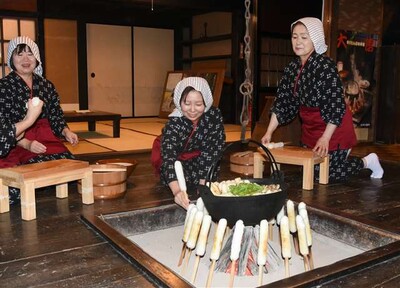 山で狩猟や炭焼き、杉伐採作業に従事した男たちが、山小屋生活の中で、残ったご飯をこねて丸め、くしに巻き付け焼き、仕留めた鳥やキノコなどの鍋に入れたり、そのままみそを塗って食べたのが始まりと伝えられている。また朝、あるいは昼食用として狩りなどに持ち込み、食べ残したおにぎりをそのまま鍋に入れたという説などもある。