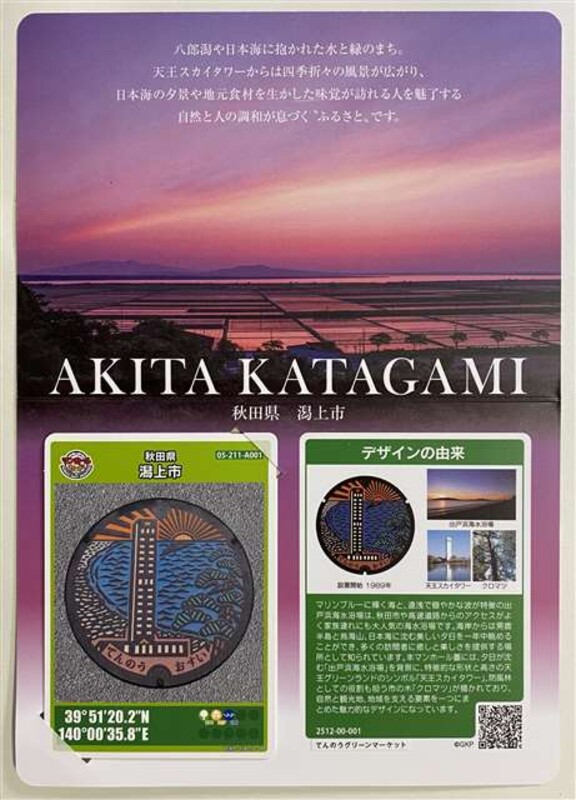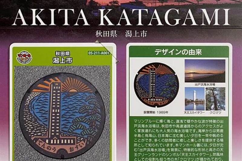 秋田県潟上市は独自にデザインしたマンホールのふたのコレクションカード「マンホールカード」を、道の駅てんのう内てんのうグリーンマーケットで無料配布している。