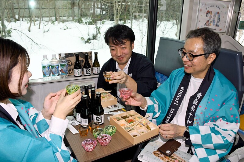 青森県三沢市の温泉宿泊施設「青森屋 by 星野リゾート」は青い森鉄道と連携し、県内の地酒や「あで(酒のさかな)」を味わいながら車窓の雪景色を楽しむ三沢発青森行きの「酒のあで雪見列車」を24日から土日に計8回運行する。雪見列車の運行10周年を機にPRする地域を同鉄道沿線から全県に拡大する。17日にリハーサル運行し、自治体関係者らが地元PRへ意気込んだ。