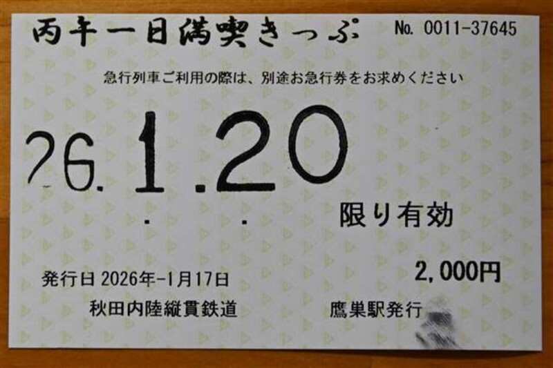 秋田内陸線を運行する秋田内陸縦貫鉄道(北秋田市)は、今年の干支(えと)の丙午(ひのえうま)にちなんだ特別企画乗車券「丙午一日満喫きっぷ」を、年内に還暦を迎える人向けに販売している。