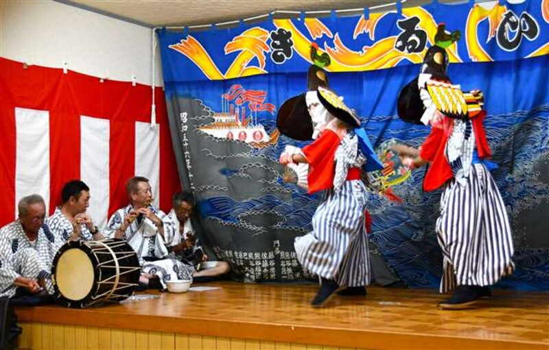 鳥海山北麓獅子舞番楽は、鳥海山の山岳信仰を背景に屋敷、坂之下、濁川(以上由利本荘市)と伊勢居地(いせいじ)、釜ケ台、冬師、小滝、横岡(以上にかほ市)の各地区で受け継がれてきた神楽。11年に重要無形民俗文化財に指定された本海獅子舞番楽(由利本荘市鳥海町)がルーツといわれ、現在は各地区の保存会がお盆や新築の地鎮、神社祭礼などで演じている。