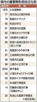 文化審議会はこのほかに高知県の「大豊の碁石茶製造技術」、宮崎県の「高鍋神楽」など4件を重要無形民俗文化財に指定するよう答申。三重県志摩市に伝わる「志摩半島の生産用具 真珠養殖関連資料」1件を重要有形民俗文化財に指定することも盛り込んだ。いずれも答申通り告示される見通しで、重要無形民俗文化財は342件、重要有形民俗文化財は229件となる。