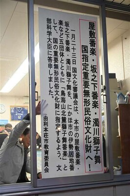 湊貴信市長は「保存会、関係者の皆さまに心からお祝い申し上げる」と指定を祝福。市教育委員会文化財保護室専門員の三浦良隆さん(63)は「市内の番楽の歴史を語る上で貴重な芸能で、そろって指定されるのは非常に意義深い」とした上で、「地域振興や観光などにつながれば、担い手の励みにもなる」と話した。