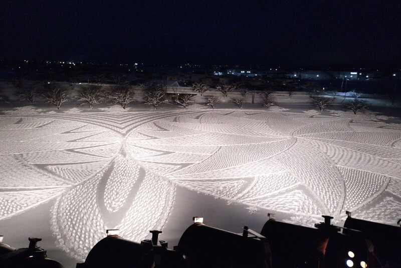 ベックさんは同日午前10時から作業を始め、夕方までかけて縦約90メートル、横約140メートルの雪原に幾何学模様を描き出した。ベックさんは「雪はいい状況。シンプルな作業だが、ミスをしないよう心がける」と、真剣な表情でスノーシューを踏みしめていた。