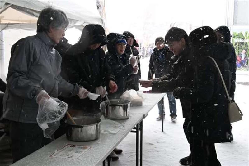 屋外では、大鍋で作ったみそ味の「秋田かやき」が無料で500杯振る舞われ、長蛇の列ができた。25日は、しょうゆ味のかやき鍋が振る舞われる。