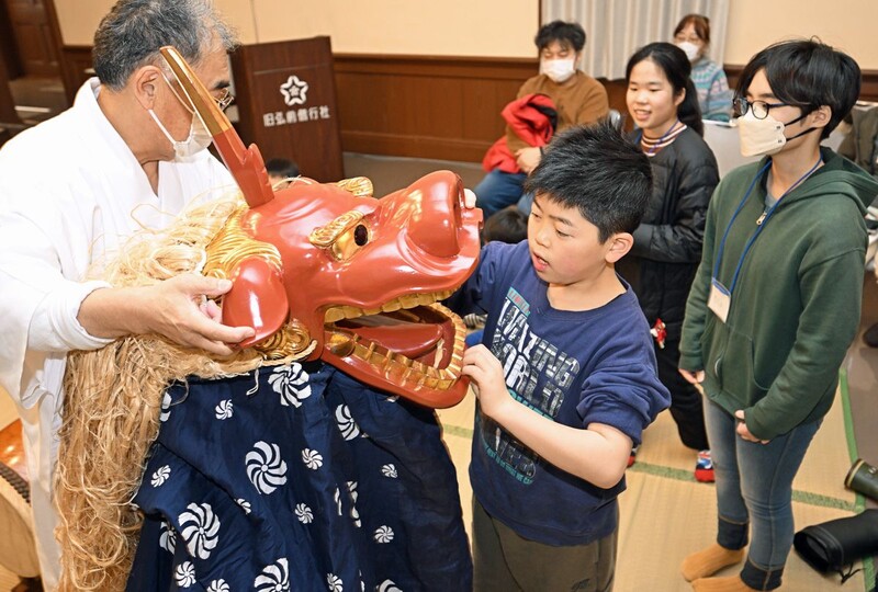 体験コーナーでは、子どもたちが自分で太鼓や笛などの音を出したり、面や獅子頭、太刀を身につけ感触を確かめた。同市の佐々木清香さん(弘大付小1年)は「大きな音が出る太鼓は楽しい。お面は顔がちょっと怖かった」と話した。