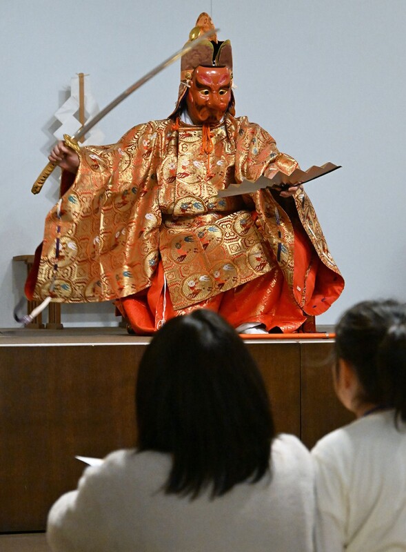会場には演目で使われる面や衣装、太刀、太鼓などの楽器を展示し、保存会メンバーはそれぞれの意味合いを説明。天孫降臨の際の猿田彦命(さるたひこのみこと)をあらわした演目「宝剣」を実演した。