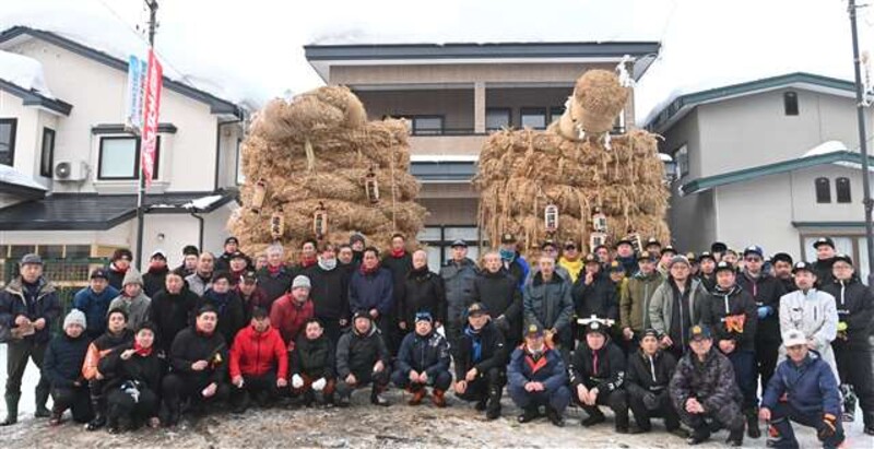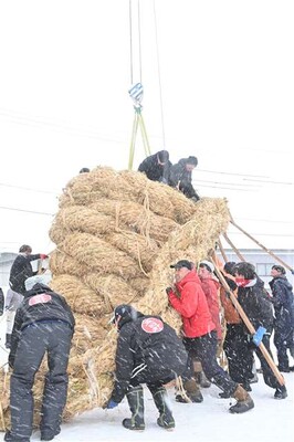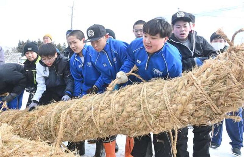 30日の作業には西仙あおぞらこども園の園児や西仙北小、西仙北中、西仙北高の児童生徒約150人が参加。雄綱の綱よい作業では行事を仕切る「建元」のかけ声に合わせ、小中高生らが「ジョヤサー」と叫びながら綱を持ち上げ、3本の綱をねじるように編んでいった。雪が舞う中、コートを脱ぎ体育着姿で綱を運んでいた西仙北中2年の堀江皇さんは「かけ声を出していたら暑くなってきた。本番は勝ち負け関係なく、全員で楽しみたい」と話した。