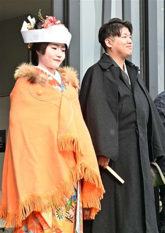 行事の主役を務めたのは、昨年8月に結婚した同町新町出身の会社員仙道善さん(23)と、秋田市出身で看護師の妻万維さん(25)。昨年テレビで花嫁道中の様子を見た万維さんが地域の伝統文化に感動し、夫婦で参加を決めたという。