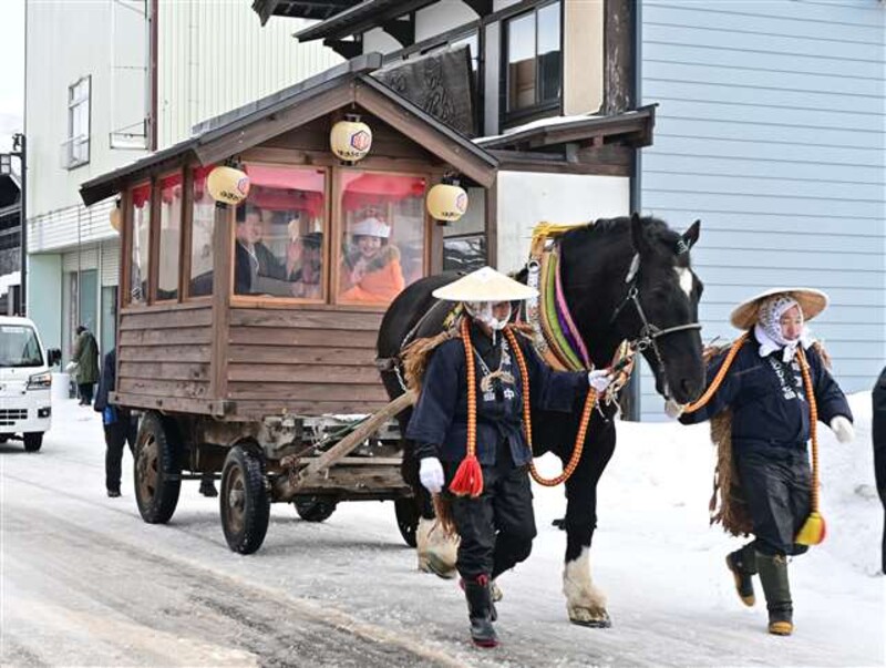 秋田県羽後町の冬の恒例イベント「ゆきとぴあ七曲」が31日、町内で行われた。昔ながらの嫁入りを再現するメイン行事「花嫁道中」では、和装姿の新郎新婦を乗せた馬車がおよそ14キロの道のりを進み、町民らから祝福を受けた。