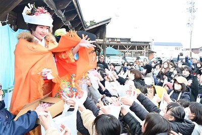 同町西馬音内の道の駅うごで行われたオープニングセレモニーの後、馬引きや長持ち担ぎを担う人たちと午後1時20分ごろ出発。一行は三輪地区の元稲田(げんどうだ)神社(通称・あぐりこ神社)でお参りしたほか、西馬音内地区のかがり火広場では集まった多くの町民らに幸せのお裾分けとして紅白餅をまいた。