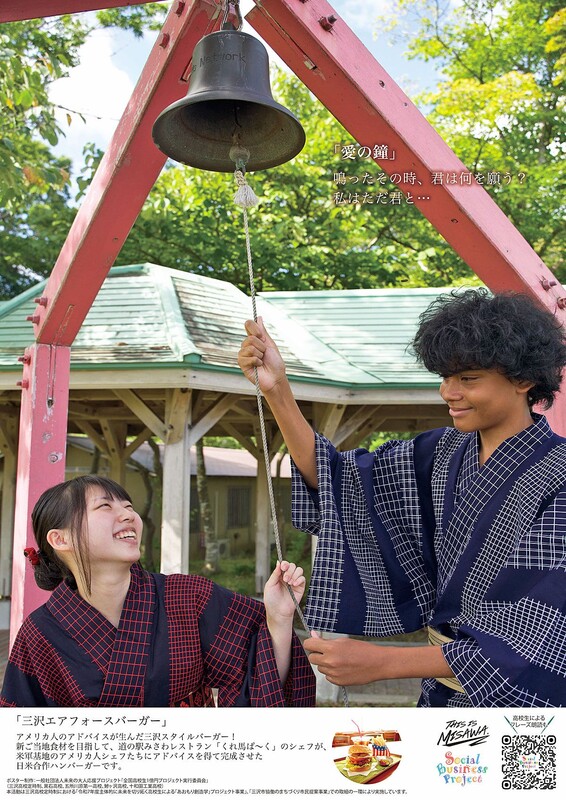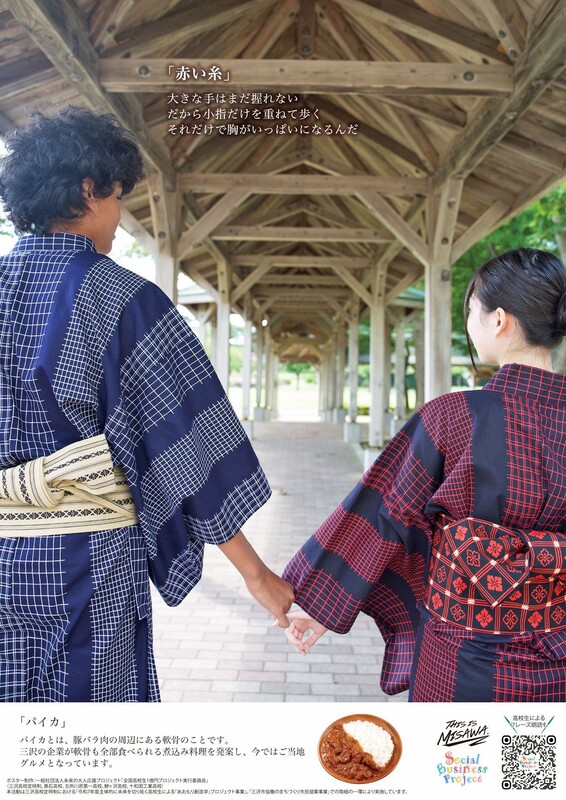 生徒らは昨年9月、スカイプラザミサワと道の駅みさわで撮影。「赤い糸」という作品は、浴衣姿の高校生男女が小指を絡めて歩いている場面に「大きな手はまだ握れない/だから小指だけを重ねて歩く/それだけで胸がいっぱいになるんだ」というフレーズを添えた。