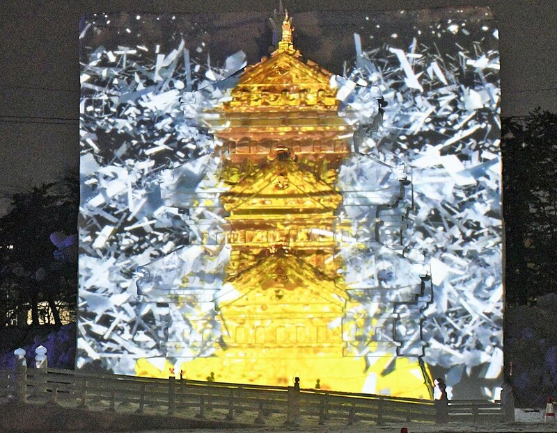 試験点灯ではリンゴが実っていく様子や、天守を戻す曳屋(ひきや)をPRする同市のマスコットキャラクター「たか丸くん」が大雪像へ立体的に映し出された。映像を担当した同市のデジタルクリエーター葛西薫さん(52)は「プロジェクションマッピングならではの質感の変化や表現を楽しんでほしい」と話した。