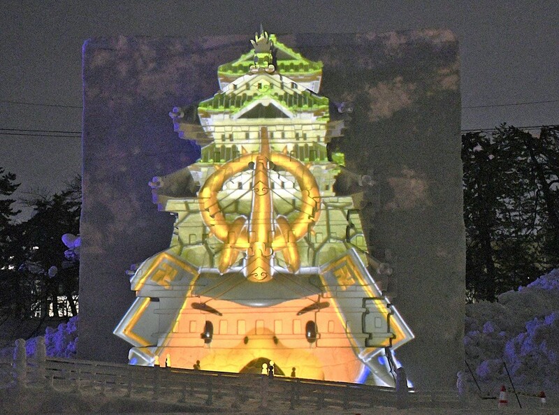 青森県弘前市の弘前公園で6日、「弘前城雪燈籠(どうろう)まつり」が開幕する。今年は1977(昭和52)年の第1回から数えて50回の節目。開幕前日の5日は大雪像のプロジェクションマッピングなどの試験点灯を行い、関係者らが開幕に向け準備を整えた。会期は11日まで。