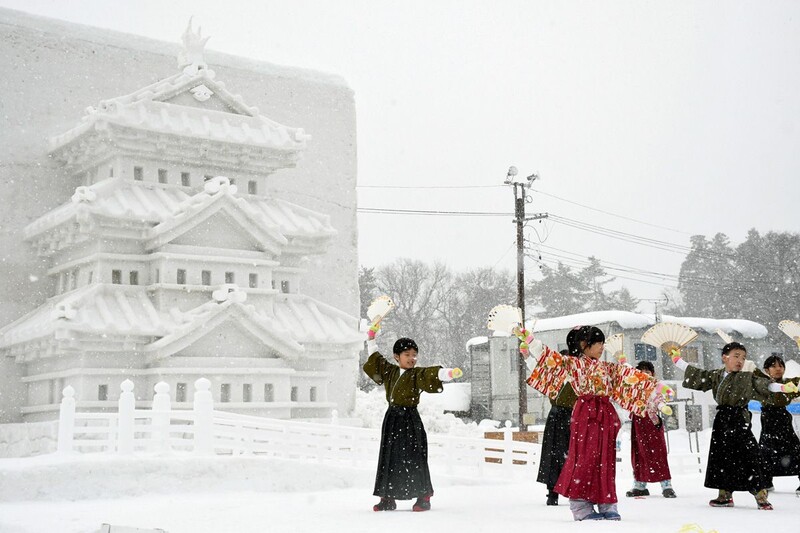 6日午前、弘前公園四の丸で行われた開会式では、大雪像の制作を担当した陸上自衛隊弘前駐屯地の田村徹司令と、雪像制作代表者で弘前工業高校2年の櫛引翔馬さんがまつり運営委員長の桜田宏市長に雪像を引き渡した。続いて、同市のひかりこども園の園児が歌謡曲「ああ弘前城」に合わせた踊りを披露し、節目の開幕を祝った。
