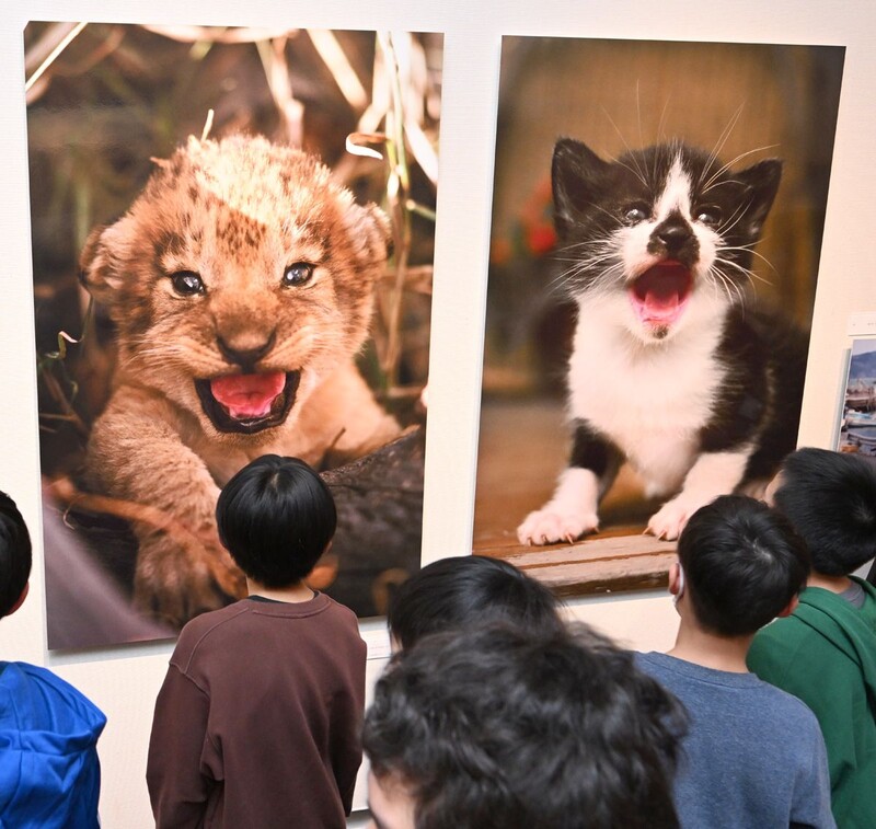 内覧会では吉田健教育長ら関係者のほか、時敏小学校の5年生32人が同館学芸員の三國良一さん(55)から説明を受けながら作品を鑑賞。愛情あふれる親子やじゃれ合う子どもたち、獲物をくわえ悠々と歩く場面など、共通のしぐさやかわいらしさ、野性味を感じ取った。山田佑飛(ゆうと)さん(11)は「寝姿や子どもたちのかわいらしさが一緒で、こんなにネコとライオンの共通点が多いと思わなかった。もっとじっくり見たいのでまた来たい」と話した。