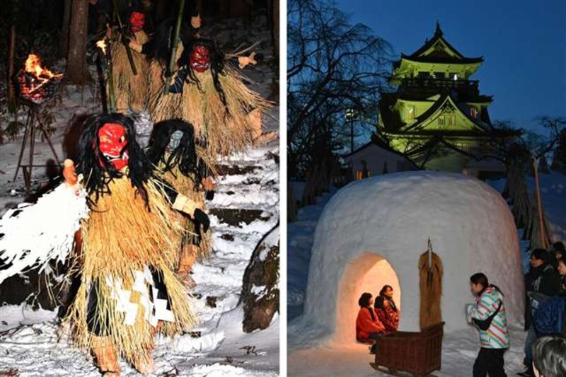 今月行われる男鹿市の「なまはげ柴灯(せど)まつり」(13~15日)の会場近くと横手市の小正月行事「かまくら」(13、14日)の会場で、それぞれの行事を楽しめるコラボ企画が実施される。柴灯まつり会場近くにはかまくら1基が設けられ、かまくらの会場ではナマハゲ太鼓が鳴り響く。
