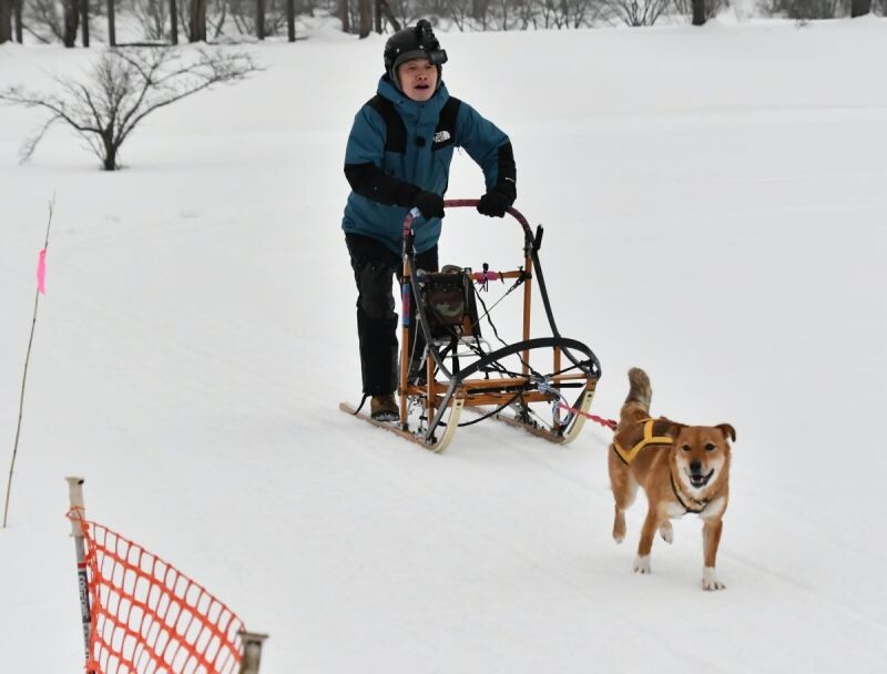 犬ぞりを体験する参加者。愛犬に引かせて一緒に滑ることもできる