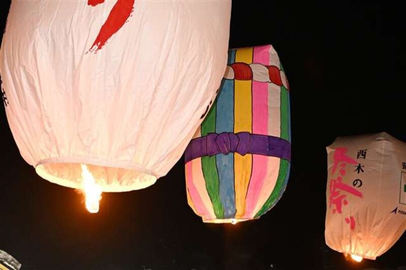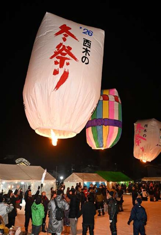 秋田県仙北市西木町上桧木内地区の小正月行事「紙風船上げ」が10日夜、市紙風船館隣の紙風船広場で行われた。地区は昨年8月の記録的大雨で甚大な被害を受けており、住民らが復興を支えてくれた人たちへの感謝や、1年の平穏などの願いを込めて作った約60個の紙風船が夜空に舞い上がった。上桧木内紙風船上げ保存委員会の主催。