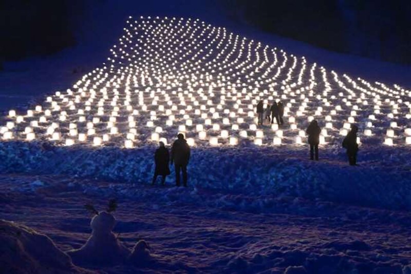 秋田県湯沢市の秋の宮温泉郷の冬季イベント「かだる雪まつり」が7日、旧秋ノ宮スキー場で開かれた。斜面を埋めた約3千個のミニかまくらに明かりがともされ、幻想的な光景が広がった。