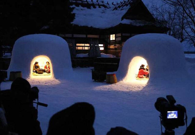 木戸五郎兵衛村にはかまくら4基を設置。12日は県内外のアマチュアカメラマンが集まり、かやぶき屋根の古民家を背景に、子どもが七輪を囲む風景を思い思いに写真に収めた。13、14日は踏み俵や箱ぞりの体験会も行われる。