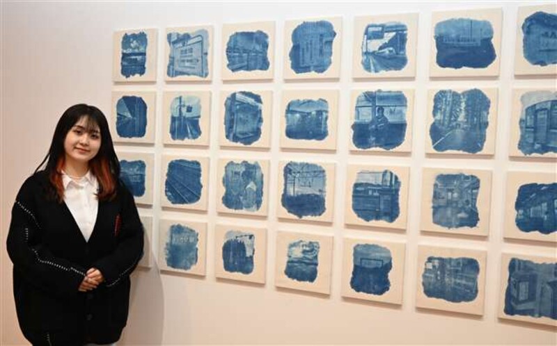 池端さんは、スマートフォンで撮影した日常の写真40枚をネガフィルム化し、日光で布に焼き付けた。大学4年間の通学で使った地元の東能代駅と新屋駅の風景を、味わい深い色調で表現した。「日照時間が比較的少ない秋田の太陽光を使って、ここにしかない自然を作品に取り込んだ」と話した。