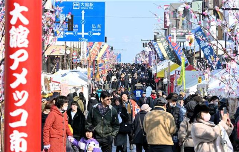 秋田県大館市の小正月行事「大館アメッコ市」が14日、同市字大町のおおまちハチ公通りで開幕した。この日にあめを食べると風邪をひかないといわれ、縁起物のあめを買い求める多くの家族連れや観光客でにぎわった。15日まで。