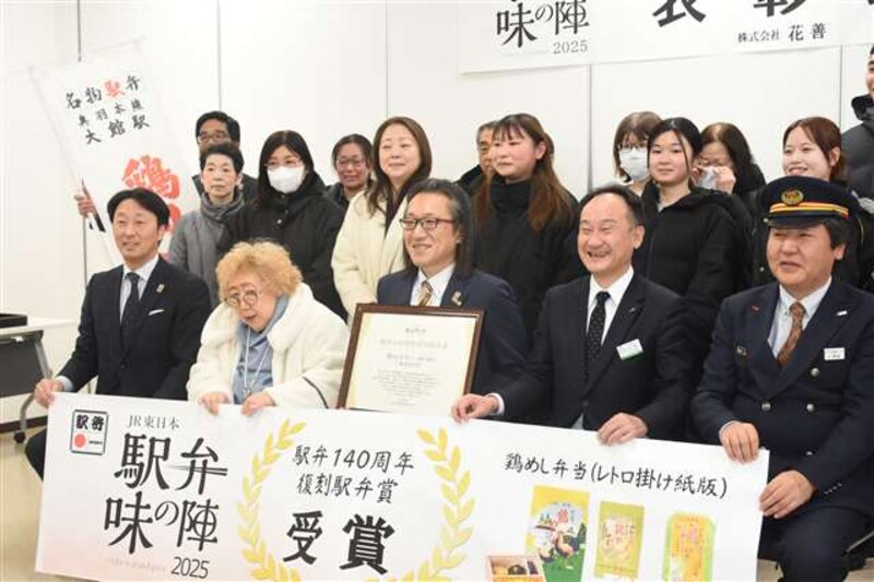 JR東日本の駅弁コンテスト「駅弁味の陣2025」の表彰式が秋田県大館市のJR大館駅で行われ、「駅弁140周年復刻駅弁賞」を受賞した大館市の駅弁製造販売「花善」(八木橋秀一社長)に表彰状が送られた。