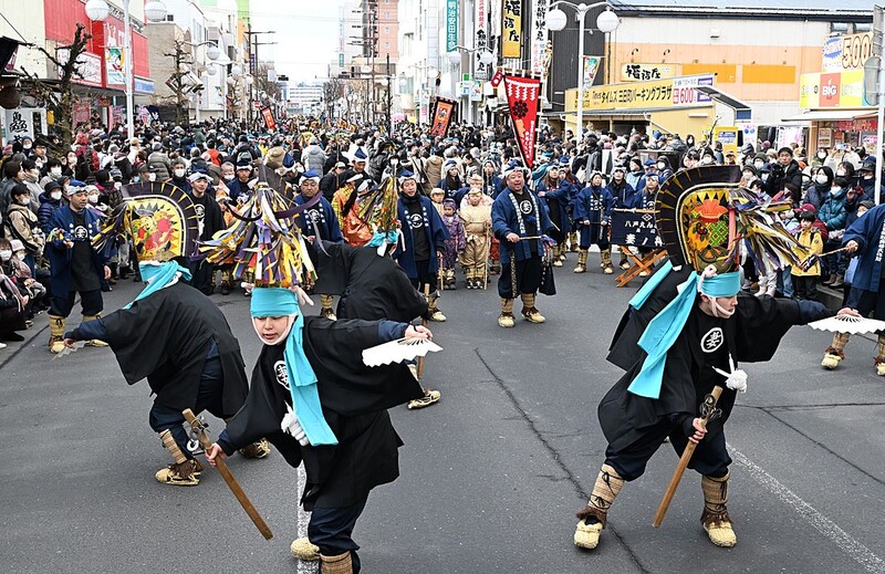 800年以上の歴史を持ち、県南地方に春の訪れを告げる「八戸えんぶり」が17日開幕した。初日は市中心街で、34組の全えんぶり組が参加する「一斉摺(ず)り」を行い、豊年満作を祈った。同日朝の長者山新羅神社では、八太郎えんぶり組を先頭に摺りを奉納。その後、中心街に移動して一斉摺りが始まると、太夫らは力強い摺りを、子どもたちは色鮮やかな衣装で祝福芸を演じた。会期は20日まで。18日は史跡根城の広場などで公演を行う。
