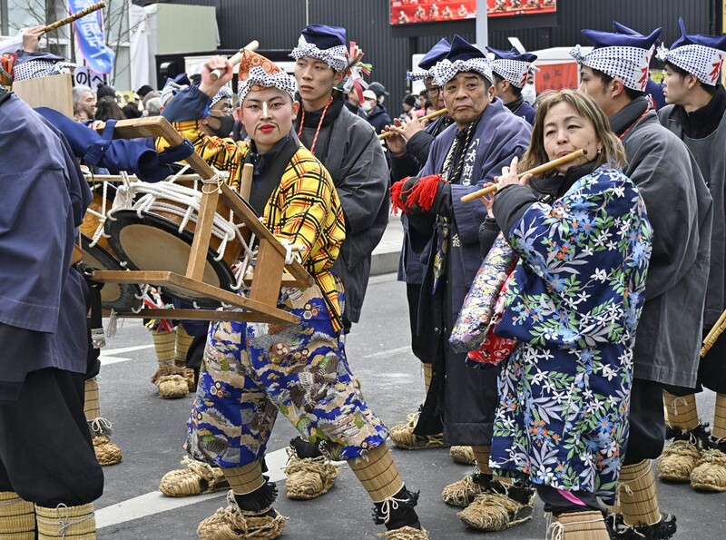 同市三日町の「はっち」付近で行った一斉摺(ず)りで、空斗さんは大黒舞とおはやしの太鼓を担当。大勢の観客を前に、統さんの唄と文恵さんの笛に合わせ、軽やかにばちを振るい、舞を披露した。「えんぶりは『さみ(寒)いなー』と言いながらやるのが好き。組によっておはやしや摺り、舞が違うところに学びがある」と空斗さんは熱く語る。一方で、少子高齢化により伝統芸能を担う若手が減っていることに危機感を抱く。「僕たちを見て、若い人がえんぶりに興味を持ってもらえたら」。来年以降は大江さんらが同組に残り、空斗さんの思いを引き継ぐという。