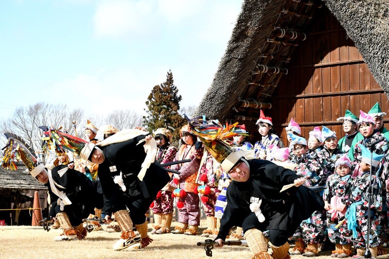 青森県八戸市で開催中の「八戸えんぶり」は3日目の19日、同市の史跡根城の広場で「史跡根城えんぶり」を行った。冷たい風が吹き付ける中、国内外から200人以上の観覧客が来場。復元された中世の建物前で繰り広げられる摺(す)りや舞を楽しんだ。