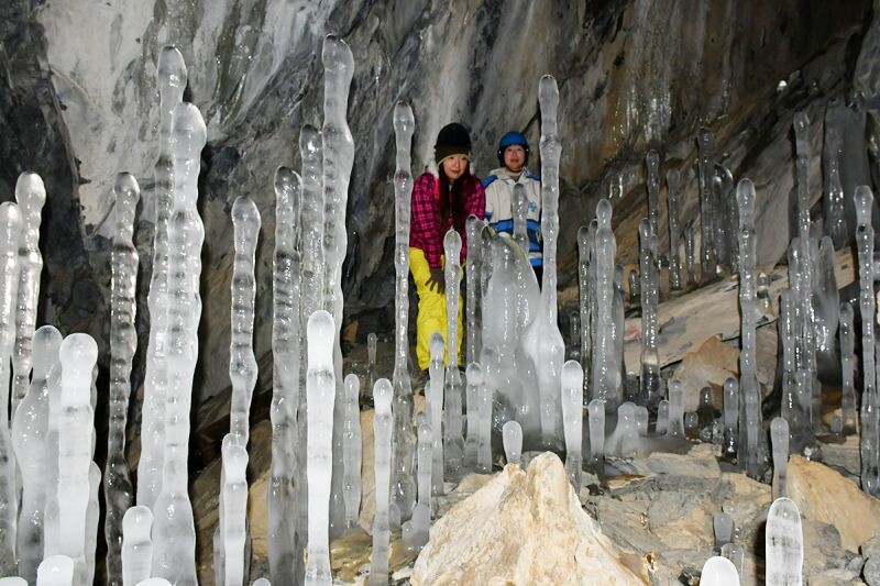 洞窟の入り口付近に大小約200本の氷筍が並び、照明の光で幻想的に輝く。昨年より全体的に大きく、高さ2メートル超のものもある。気温や水量の条件が適していたとみられる。