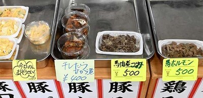 今年からは総菜の製造、販売も開始。「馬ホルモン」(500円)や「馬肉煮こみ」(500円)、「干したら甘から煮」(400円)、ポテトサラダなど家庭的な味を楽しめる。
