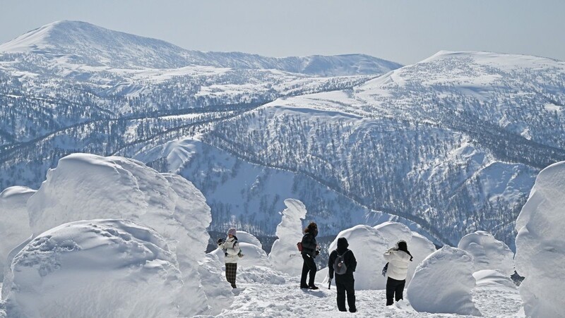 樹氷が見ごろの八甲田の田茂萢岳山頂付近も、最高気温が氷点下1度ほどで日差しが降り注ぐ好天に恵まれた。大勢のスキーヤーや観光客らが樹氷と北八甲田、南八甲田の山々、陸奥湾、岩木山の絶景を満喫。広島市の千﨑大輔さん(31)、寿美さん(29)夫婦は「樹氷や景色の壮大さに感動。思ったより寒くなく、いい日に来た」と話した。