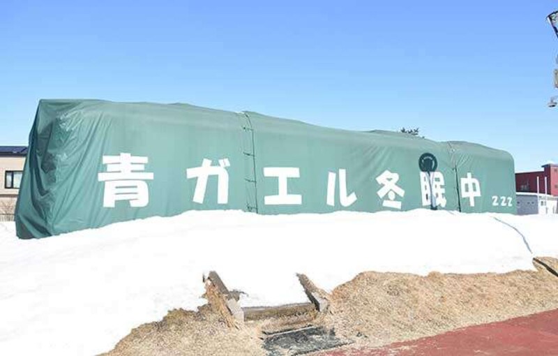 車両は2020年に東京・渋谷駅前のハチ公前広場から移設。青ガエル目当ての鉄道ファンも多く、人気は根強い。冬場は降雪による車体の劣化を防ぐために緑色のシートで覆って冬囲いしており、今季は昨年12月1日から冬眠に入った。