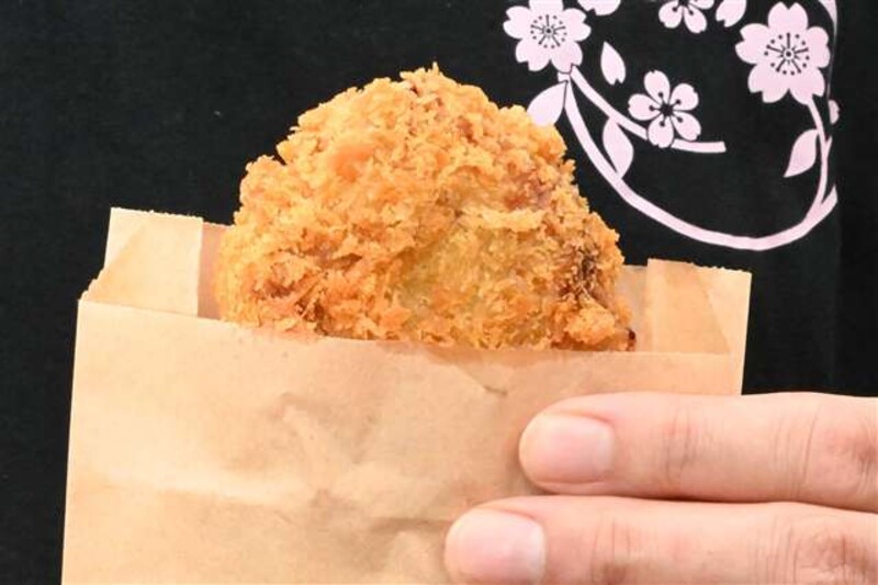 商品名は「角館お狩場メンチ」。県産豚を使用。ふんわりと香る山椒の風味や、片手で楽しめる手軽さが話題となり人気を集めている。