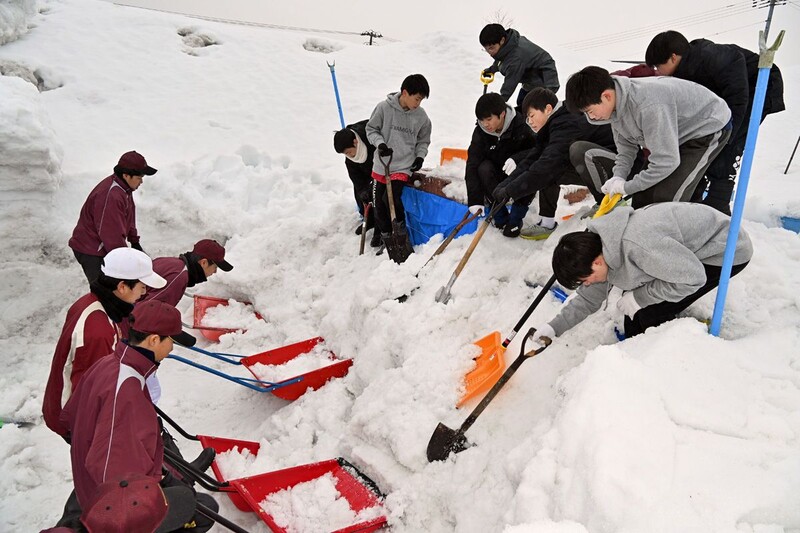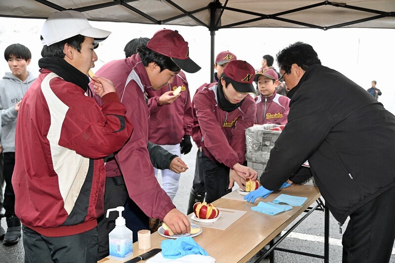 大阪府出身のバドミントン部2年・新田大晃(ひろあき)さん(14)は「雪の中で長く熟成されていたということで、果汁も多くシャキシャキしておいしかった。雪かきの後は格別」と声を弾ませた。実家がリンゴ農家だという野球部2年・工藤颯介(そうすけ)さん(14)は「雪が重くて雪かきは大変だったが、リンゴは甘みと酸味のバランスが取れていておいしかった」と笑顔を見せた。
