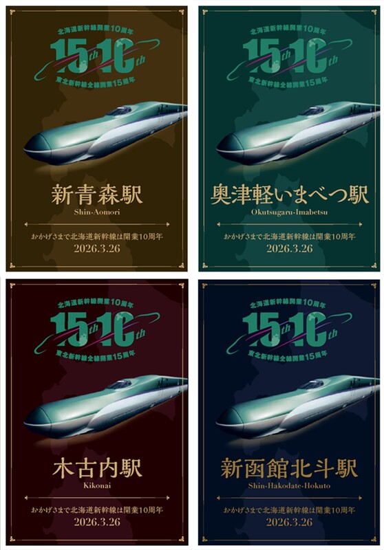 26日の北海道新幹線開業10周年を記念し、JR北海道とJR東日本は21日から新青森(青森市)、奥津軽いまべつ(今別町)、木古内(北海道木古内町)、新函館北斗(同北斗市)の4駅で記念カードを配布する。当日有効の乗車券類か入場券(定期券を除く)を各駅の新幹線の有人改札で提示すると、1人1枚もらえる。