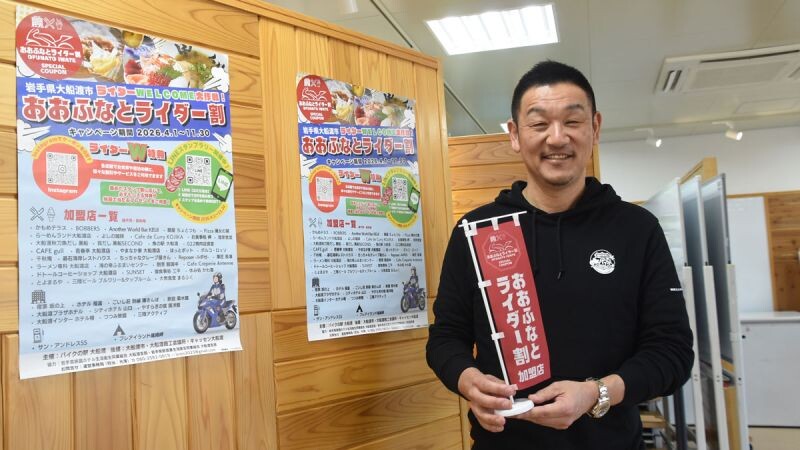 大船渡市大船渡町の無料休憩所「バイクの駅」(佐藤恵司駅長)は4月1日から、バイクで同市を訪れた人向けのキャンペーン「おおふなとライダー割」を始める。2年目となる今年は、新たにLINE(ライン)を使ったデジタルスタンプラリーを導入。新たな観光客層を開拓し、地元経済の活性化を目指す。