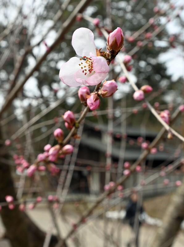 桜の名所として知られる青森県弘前市の弘前公園で、モモの仲間「ロトウザクラ」の花がほころび始めた。26日の午前中は2輪咲いており、穏やかな陽気の中、来園者が春の息吹を感じながら花を眺めていた。