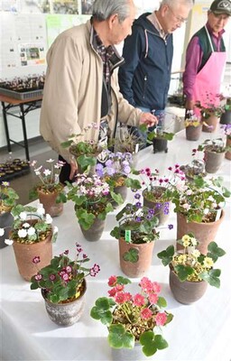 27日はそれぞれが育てた雪割草を運び込み、1階通路に並べた。おしべとめしべがともに花弁化した「千重咲き」、花弁が三段に盛り上がっているように見える「三段咲き」、一つの花弁に異なる2色が入り交じる「咲き分け」といった雪割草がそろう。