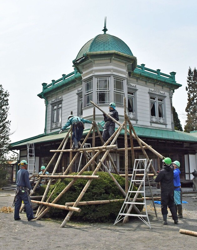 青森県平川市の国指定名勝盛美園で3月30日、雪の重みから樹木を守っていた雪囲いの解体作業が始まった。春らしい陽気に包まれた園地で、地元造園業者が手際よく板や支柱を取り外していった。1週間ほどかけて約1万2千平方メートルある庭園を回って解体作業を終え、今年は4月11日に開園する。