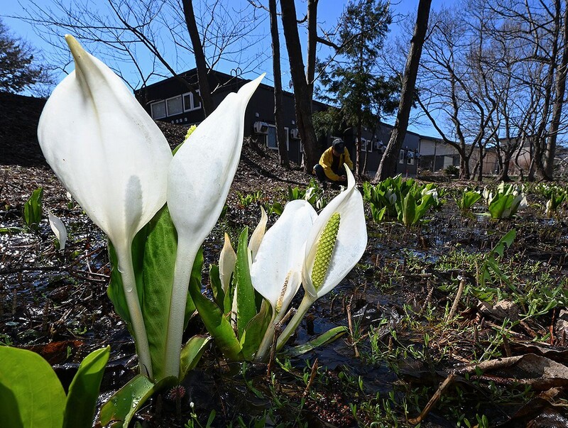 青森市原別地区の住宅街にある原別稲荷神社の湿地で、ミズバショウが見ごろを迎えつつある。好天となった8日、市内外から多くの家族連れが訪れ、純白の群生に春本番を実感していた。今週末ごろまでは十分楽しめるという。
