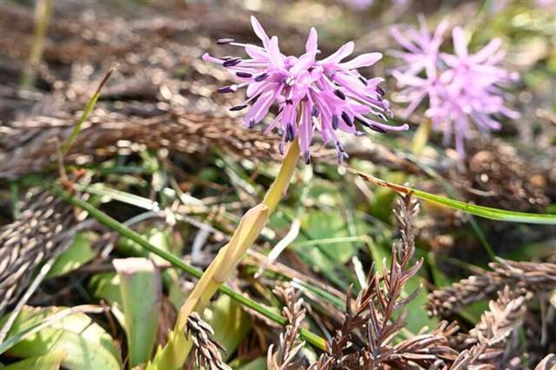 ショウジョウバカマは、シュロソウ科の多年草。遊歩道「森林浴の道」沿いの斜面に点在し、高さ約10センチのかわいらしい姿を見せている。
