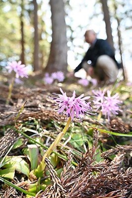 秋田県湯沢市角間沢山の市民の森では、キャンプ場近くの遊歩道沿いに紫や淡いピンク色のショウジョウバカマが咲き始めている。
