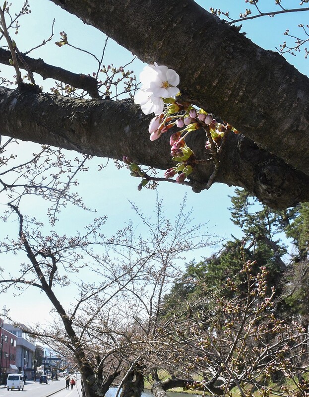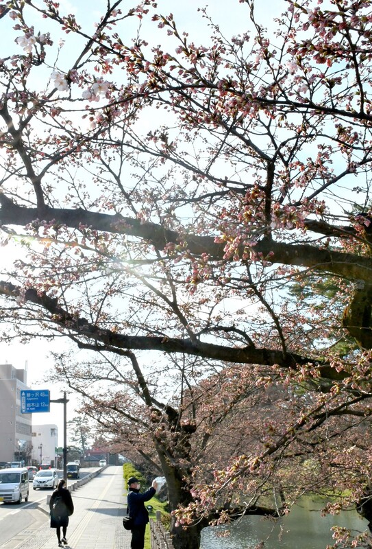 青森県弘前市は9日、弘前公園外堀でソメイヨシノが開花したと発表した。観測史上2番目の早さ。満開は15日の見込み。10日の弘前さくらまつり開幕を前に、春の陽気に誘われて次々とほころんだ桜が道行く人の目を楽しませた。